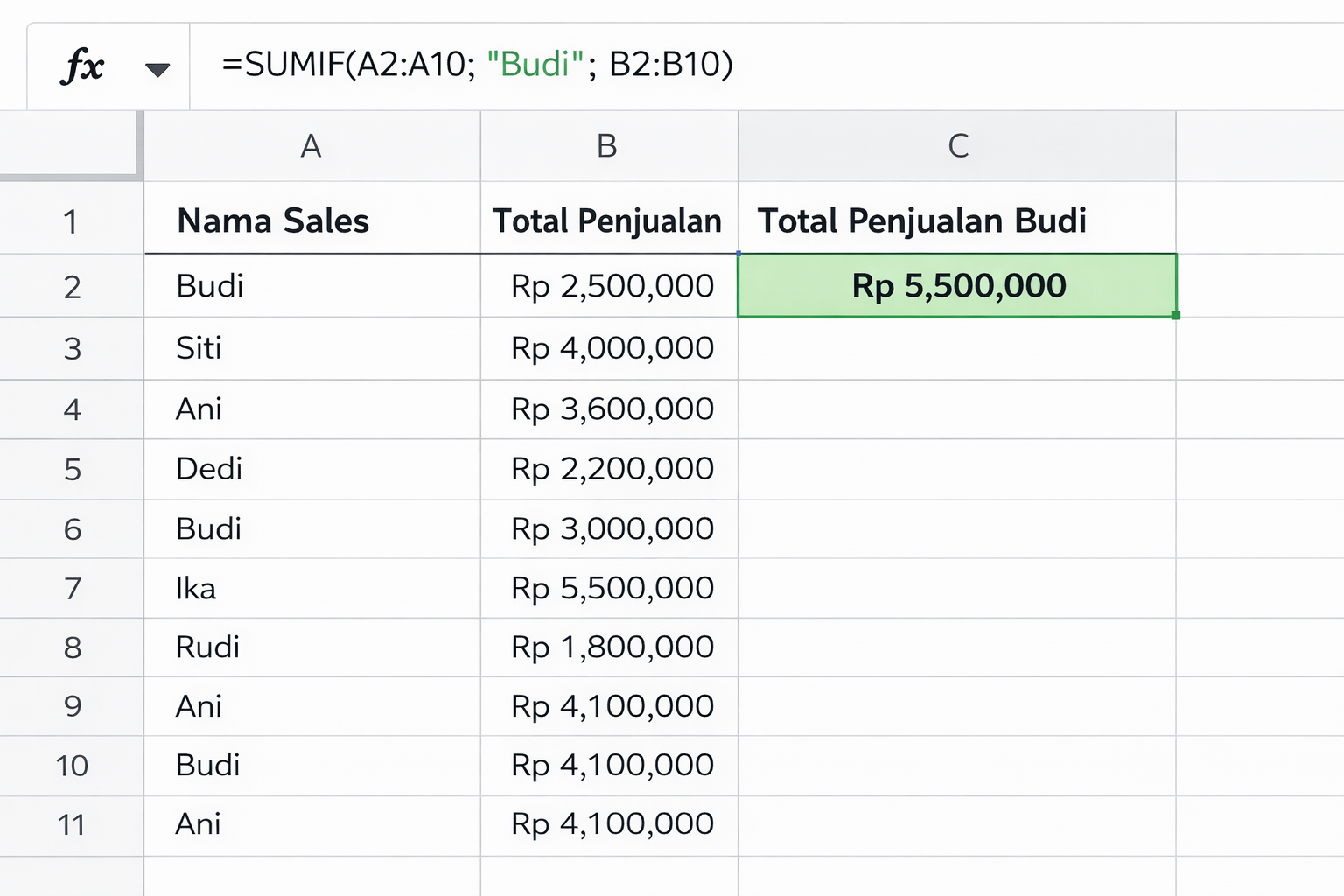 =SUMIF(A2:A10; "Budi"; B2:B10)Tekan Enter, dan voila! Hasilnya langsung muncul β¨.