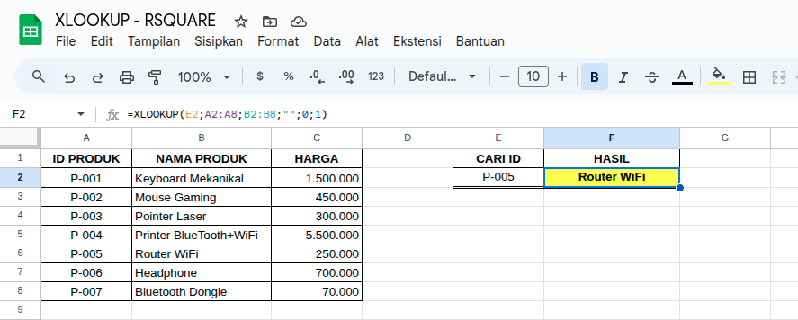 Kita mau mencari Nama Produk dan Harga berdasarkan ID Produknya. Misalnya, kita mau cari data untuk ID "P-005" yang ada di sel E2.